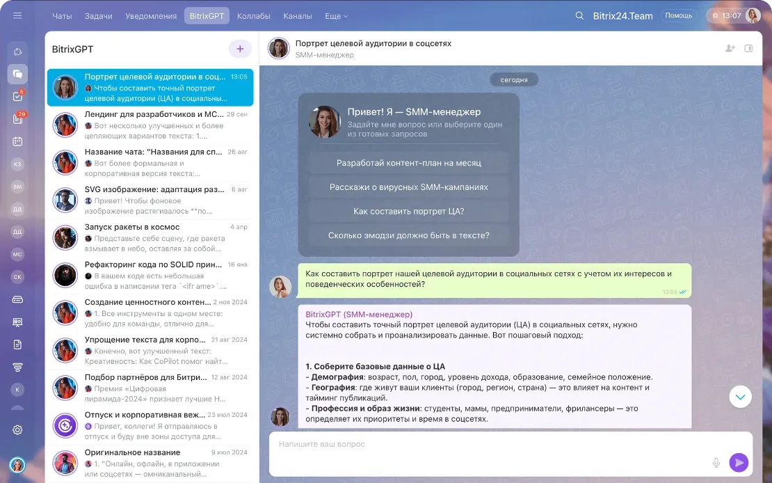 Неограниченное количество рабочих групповых и индивидуальных чатов у вас под рукой — а также Открытые линии, диалоги с внешними пользователями, обмен файлами и уведомления.