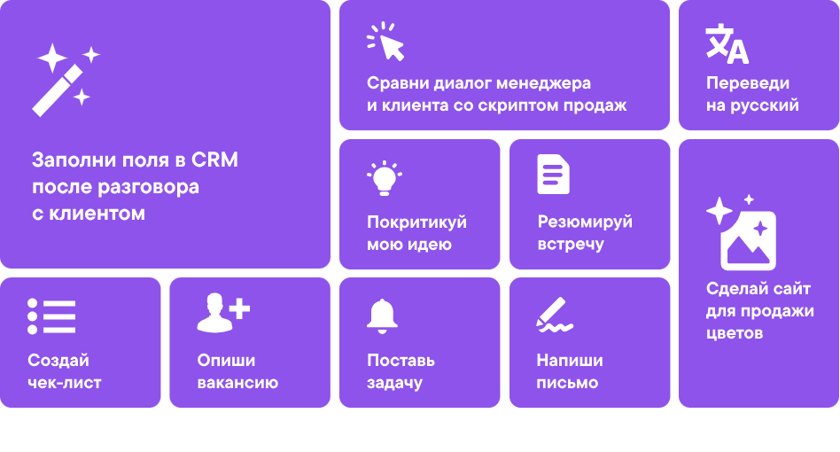 AI-помощник берет всю рутину на себя, чтобы вы могли сосредоточиться на важных проектах. Он пишет тексты, заполняет поля в CRM, готовит резюме встреч и предлагает идеи — быстро и точно.